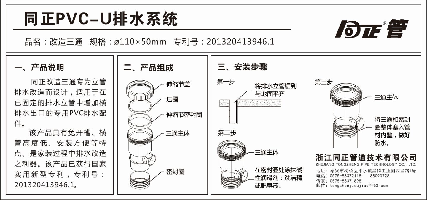 同正新品:改造三通即將于201511月底上市。該產(chǎn)品專為立管排水改造而設(shè)計(jì),適用于在已固定的排水立管中增加橫排水出口的專用PVC排水配件。