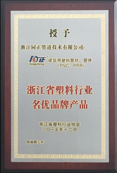 同正建筑用塑料管材、管件(PVCPP-R),被授予 浙江省塑料行業名優品牌產品”。